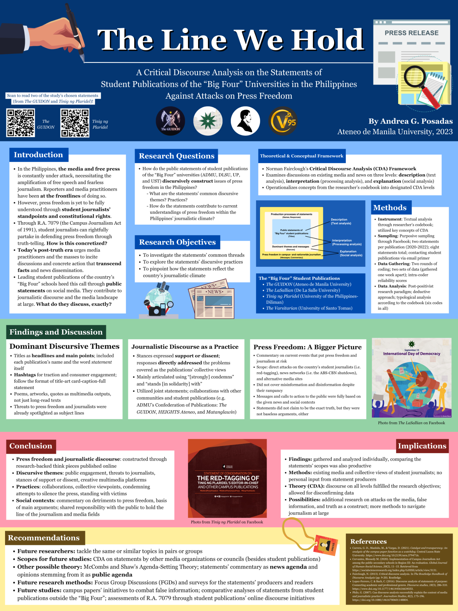 “The Line We Hold” is my undergraduate thesis. It got nominated as one of the Best Theses of the Ateneo de Manila University’s Department of Communication. My study addresses campus journalists’ plight and peril nationwide through a critical discourse analysis of their statements against attacks on press freedom.